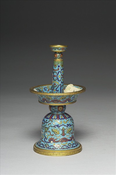 銅胎。由支柱,托盤及台座組成,缺釘形燭阡。以掐絲技法、琺瑯料填色製作花紋,上托盤外飾海棠花紋,支柱飾如意雲紋,下托盤內飾番蓮紋,外與台座同飾變形獸面紋,台座邊飾蓮瓣紋及如意雲紋。鍍金足沿飾回紋,燭臺為五供之一,本器與中琺735-739成套。