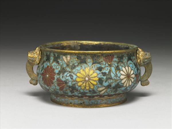 銅胎,侈口有唇,束頸,碩腹,雙獸耳,圈足。器身藍地,以掐絲技法製作花紋。外壁以纏枝花葉為主要紋飾,紅花、黃花、白花正面盛開,順次裝飾於壁面,隙地則填飾未盛開之花與捲枝花葉,近足處蓮瓣紋一圈,足外壁掐絲如意雲紋。足內露胎,刻「大明景泰年製」六字楷款。本器與他件瓶、盒共成「爐瓶盒三件」。