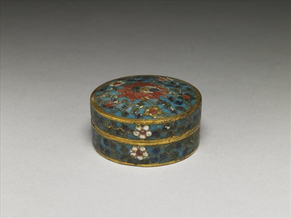 銅胎,扁圓盒,子母口,深直壁。器身藍地,以掐絲技法製作花紋,蓋面正中紅色番蓮一朵,四周繞飾捲枝花卉五朵,分別為黃、綠、藍、紫、白色花。器外壁則以卷枝花葉為飾。本器與他件爐、瓶共成「爐瓶盒三件」。