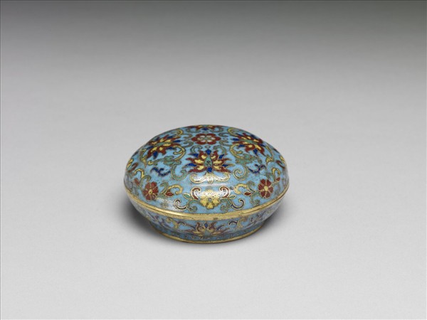 銅胎,子母口,深弧壁,圈足,帶圓頂蓋。器身淺藍地,以掐絲技法製作花紋,蓋頂正中央飾一朵六瓣花,以此花為中心,向外有兩層花卉繞圍,內層為卷枝番蓮,外層為卷枝六瓣花。腹外壁捲枝番蓮四朵。足露胎,足內鏨刻「景泰御製」雙行四字楷款。本器與他件爐、瓶共成「爐瓶盒三件」。(中琺746、747及748為一組)