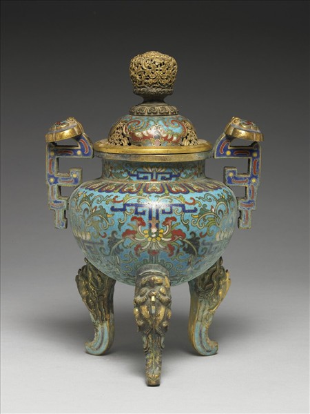 銅胎,鍍金口,短直頸,豐肩,碩腹下斂,圓底,雙幾何形耳,三獸足,帶鏤空番蓮花葉鈕圓頂蓋。器身藍地,以掐絲技法製作花紋,蓋面如意雲頭形開光內飾蝙蝠,隙地鏤雕捲枝花葉。器外壁滿飾纏枝番蓮花葉,肩另見蓮瓣紋一圈。本器與他件瓶、盒共成「爐瓶盒三件」。(中琺765、766、767為一組)