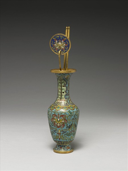 銅胎,鍍金口外撇,長直頸,豐肩,深壁漸斂,高撇足。器身藍地,以掐絲技法製作花紋,口沿如意雲頭紋,頸蕉葉,肩回紋與如意雲紋,腹外壁纏枝番蓮花葉,近足處蓮瓣紋一圈,足壁花卉,足內藍釉無款。附銅筷二、香鏟一,鏟面亦以掐絲番蓮為飾。本器與他件爐、盒共成「爐瓶盒三件」。(中琺765、766、767為一組)