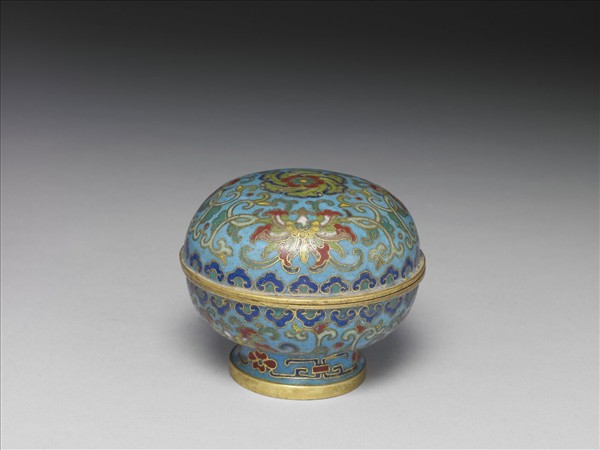 銅胎,子母口,深弧壁,圈足外撇,帶圓頂蓋。器身藍地,以掐絲技法製作花紋,蓋與器外壁以纏枝番蓮花葉為主要紋飾,口緣與蓋沿各有深藍色如意雲紋一周,足上則飾轉枝花卉。本器與他件爐、瓶共成「爐瓶盒三件」。(中琺765、766、767為一組)