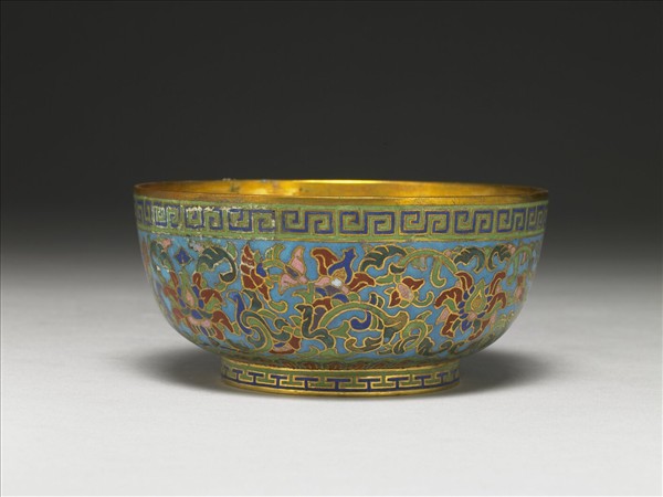 銅胎,敞口,深壁下斂,圈足小碗。碗內鍍金,器外壁以掐絲技法製作花紋,口沿露胎,下方淺綠地深藍回紋一圈。腹外壁滿飾淺藍地纏枝番蓮花葉,近足處淺綠地蓮瓣紋一圈,足內無款。