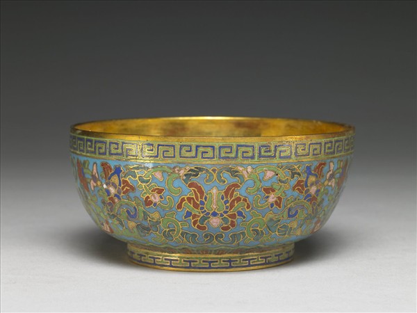 銅胎,敞口,深壁下斂,圈足小碗。碗內鍍金,器外壁以掐絲技法製作花紋,口沿露胎,下方淺綠地深藍回紋一圈。腹外壁滿飾淺藍地纏枝番蓮花葉,近足處淺綠地蓮瓣紋一圈,足內無款。