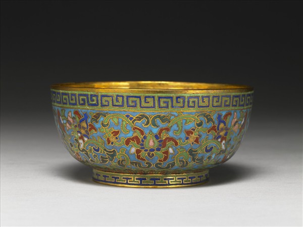 銅胎,敞口,弧壁,圈足。碗內鍍金, 器外壁淺藍地飾掐絲纏枝番蓮花葉紋,口沿、圈足分飾回紋和T字紋一周,足內無款。本器一式十件,同成一組。