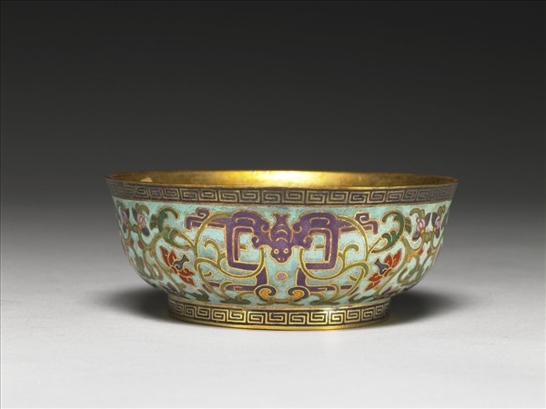 銅胎,敞口略侈,弧壁,圈足。碗內鍍金,器外壁淺藍地飾掐絲填紫藍色釉的蝙蝠三隻,皆作下俯之勢,隙地飾纏枝番蓮花葉。口沿和圈足均飾回紋一周,足內無款。