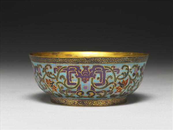 銅胎,敞口略侈,弧壁,圈足。碗內鍍金,器外壁淺藍地飾掐絲填紫藍色釉的蝙蝠三隻,皆作下俯之勢,隙地飾纏枝番蓮花葉。口沿和圈足均飾回紋一周,足內無款。