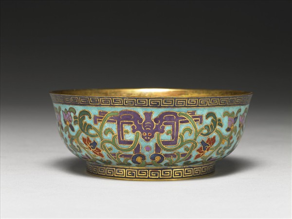 銅胎,敞口略侈,弧壁,圈足。碗內鍍金,器外壁淺藍地飾掐絲填紫藍色釉的蝙蝠三隻,皆作下俯之勢,隙地飾纏枝番蓮花葉。口沿和圈足均飾回紋一周,足內無款。