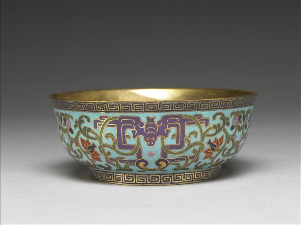 銅胎,敞口略侈,弧壁,圈足。碗內鍍金,器外壁淺藍地,飾掐絲填藍紫色釉的蝙蝠三隻,皆作下俯之勢,隙地飾纏枝番蓮花葉,口沿和圈足均飾回紋一周。足內無款。