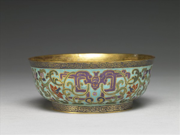 銅胎,敞口略侈,弧壁,圈足。碗內鍍金,器外壁淺藍地,飾掐絲填藍紫色釉的蝙蝠三隻,皆作下俯之勢,隙地飾纏枝番蓮花葉,口沿和圈足均飾回紋一周。足內無款。