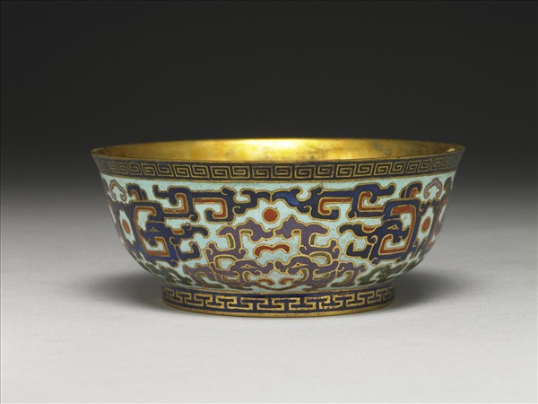 銅胎,敞口略侈,弧壁,圈足小碗。碗內鍍金,器外壁以掐絲技法製作花紋,口緣飾回紋一周,腹外壁淺藍地,滿飾夔龍紋,其中以三組成對深藍色夔龍為主調,等距排列於外壁,龍下則有綠色螭紋。而每一組深藍色夔龍間則飾以較小的成對淺紫色夔龍。圈足飾T字形紋一周,足內無款。