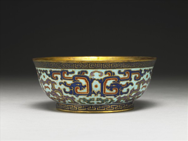 銅胎,敞口略侈,弧壁,圈足小碗。碗內鍍金,器外壁以掐絲技法製作花紋,口緣飾回紋一周,腹外壁淺藍地,滿飾夔龍紋,其中以三組成對深藍色夔龍為主調,等距排列於外壁,龍下則有綠色螭紋。而每一組深藍色夔龍間則飾以較小的成對淺紫色夔龍。圈足飾T字形紋一周,足內無款。
