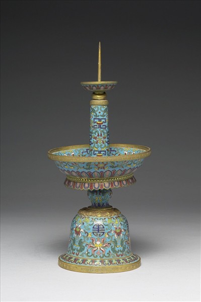 銅胎,掐絲琺瑯。燭台有大小兩層承盤,上層附金屬燭阡,足為覆鍾式。全器以掐絲琺瑯技法、琺瑯料填色作裝飾,器身與承盤內外施淺藍釉地,裝飾寶相花、番蓮紋、拐子龍、團壽字、圖案化花紋,大承盤下作俯仰蓮瓣各一周,釉色鮮艷,面多帶小氣孔。本器為五供之一,五供以香爐、瓶、燭臺成組,為供佛法器。