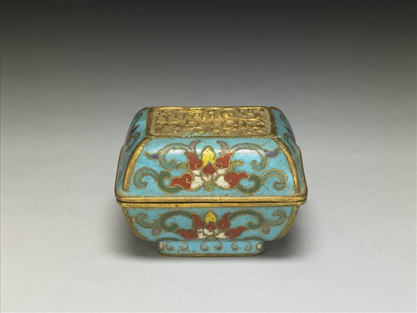 銅胎,掐絲琺瑯。長方形小盒,子母口,淺弧壁,圈足,帶平頂蓋,器與蓋約相等。全器以掐絲琺瑯技法、琺瑯料填色作裝飾,盒外壁施淺藍釉,每面飾多彩番蓮紋一朵,圈足掐絲雲紋,鍍金蓋面鏨飾纏枝番蓮紋。內壁施淺藍釉地。