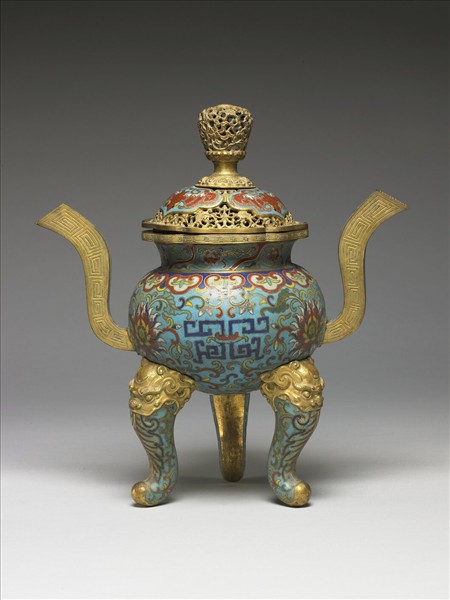 銅胎,掐絲琺瑯,足耳略鬆動。子母口,收頸,碩腹,雙朝冠耳,圓底,下接飾獸首三足,帶鍍金鏤空寶珠鈕蓋。全器以掐絲琺瑯技法、琺瑯料填色作裝飾,器身施淺藍釉為地,腹部飾纏枝番蓮紋與拐子龍,肩頸纏枝花卉與雲紋各一道,足為葉紋與番蓮紋。蓋面除四個雲形藍地紅蝠開光,皆鏤雕番蓮紋,鈕亦如是,鏨刻金工精美。本器為五供之一,五供以香爐、瓶、燭臺成組,為供佛法器。