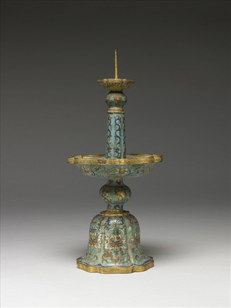 銅胎,掐絲琺瑯。燭台有大小兩層承盤,上層附金屬燭插,足為覆鍾式,全器作六瓣花式造形。器身與承盤內外施淺藍釉地,飾寶相花紋、雲頭紋、番蓮紋、螭與朵花等。釉色鮮艷,面微帶小氣孔。本器為五供之一,五供以香爐、瓶、燭臺成組,為供佛法器。