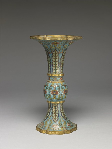 銅胎,掐絲琺瑯。仿青銅酒器觚的形式,喇叭口,長頸,圓腹,高撇足,全器以掐絲琺瑯技法、琺瑯料填色作裝飾,俱作六瓣花式造形。器身與口內施淺藍釉為地,腹飾番蓮紋與朵花各一周,口足對稱飾蕉葉紋與番蓮紋,口內亦作番蓮紋,鍍金口沿及足沿鏨飾回紋。釉色鮮艷,面微帶小氣孔。本器為五供之一,五供以香爐、瓶、燭臺成組,為供佛法器。