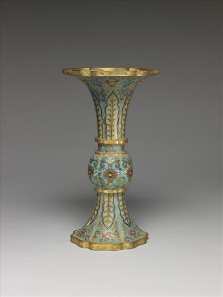銅胎,掐絲琺瑯。仿青銅酒器觚的形式,喇叭口,長頸,圓腹,高撇足,全器以掐絲琺瑯技法、琺瑯料填色作裝飾,俱作六瓣花式造形。器身與口內施淺藍釉為地,腹飾番蓮紋與朵花各一周,口足對稱飾蕉葉紋與番蓮紋,口內亦作番蓮紋,鍍金口沿及足沿鏨飾回紋。釉色鮮艷,面微帶小氣孔。本器為五供之一,五供以香爐、瓶、燭臺成組,為供佛法器。