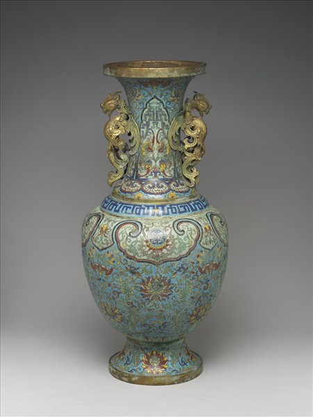 銅胎。撇口,長頸,雙鳳形耳,階式肩,斂腹,高圈足外撇。以掐絲技法製作紋飾,口沿為一圈回紋,頸部上端為蝙蝠及蓮花紋,下方為蕉葉形開光,內飾拐子龍紋及鳳鳥,肩部飾如意雲形開光內填蓮花紋,及一圈拐子龍紋,腹部上端飾有一圈如意雲形開光,內飾番蓮紋及團壽,下方為藍地番蓮紋及蝙蝠紋,腹部下緣飾一圈蓮辦紋,圈足上為一圈番蓮紋。