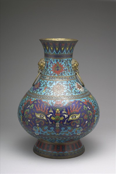 銅胎。敞口,溜肩,垂腹,鎏金雙獸首啣環耳,高圈足外撇。以掐絲技法、琺瑯料填色製作花紋,口沿飾蕉葉紋,頸、肩飾纏枝番蓮紋,腹部飾獸面紋及番蓮紋,各組紋飾間以回紋、花卉紋及環帶紋邊飾,圈足飾蓮瓣紋。