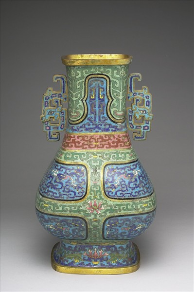 銅胎。全器呈長方形,長頸,雙螭形耳,溜肩,垂腹,高圈足外撇,鎏金口及足沿。以掐絲技法、琺瑯料填色製作花紋,頸部以上下蕉葉形開光對合,分成淺藍、淺綠兩區塊,肩部有一粉紅色橫條,腹部構圖仿銅器壺的造型,有如淺綠色直條橫帶以番蓮紋釘扣錯成套帶之紋路,各色塊中皆填以較深之同色夔龍紋。圈足飾淺藍地番蓮紋,隙地飾深藍色夔龍紋。