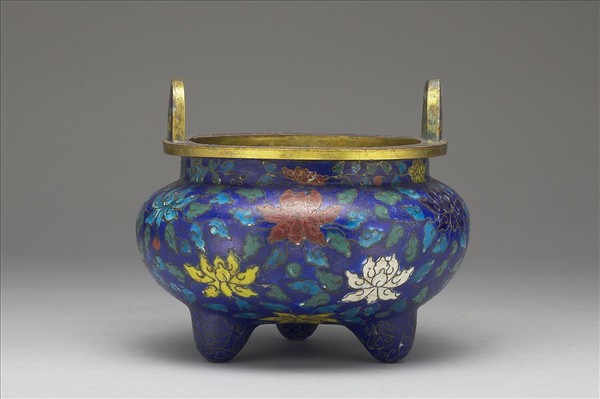 銅胎。直口,雙立耳,短頸,扁腹,三袋形足,以掐絲技法製作紋飾,全器為藍地番蓮花紋,器身及耳之花葉填有紅、黃、白、綠、淺藍等色,圈足部分花葉與地同色。