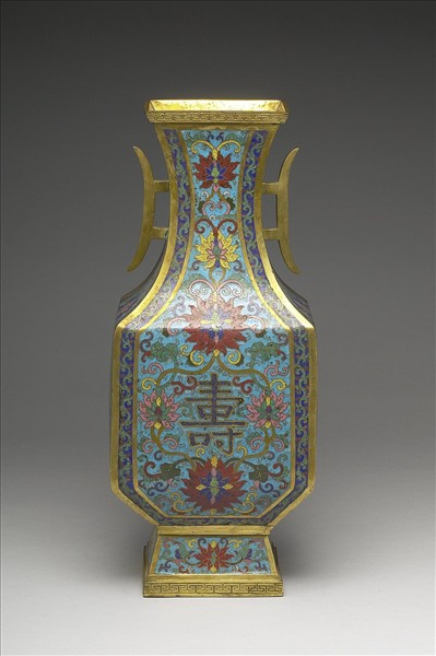 銅胎。長方形,撇口,長頸,雙耳,溜肩,直長腹,下緣內收,高圈足外撇。以掐絲技法製作紋飾,口沿及圈足下緣鑄有回紋,瓶身四面外緣以藍地卷葉紋為邊飾,內部為淺藍地纏枝番蓮紋,正反面腹部各有一藍色壽字,字內以銅絲飾S形紋,圈足飾淺藍地纏枝番蓮紋。底部露胎,有鑄造陽紋「大清乾隆年製」三行楷書款。