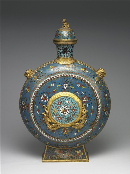 銅胎。侈口立沿,削肩,扁圓腹,肩側鑲甪端雙耳,腹鑲二鍍金降龍,帶一蓮瓣座獅鈕子母口蓋。當中插入一圓牌(其一圓插牌係後配),圓牌取下,內飾一朵番蓮花,其中一面中有抽屜,取出抽屜,可見圓牌上方有器底封實,下方有一杯形下凹的空間;外撇的高足兩側有半圓形小孔,供繩索繞過底部後穿經此孔,沿瓶側通過雙耳在上方繫結懸掛。器表以掐絲技法製作紋飾,淺藍地佈草莓紋為錦,裝飾各種花卉,器底鑄去地陽文「乾隆年製」二行楷書雙方框款。此型器皿原來應由皮革製成,盛液體掛在馬背,故稱背壺,也有俗稱此為抱月壺或寶月壺。