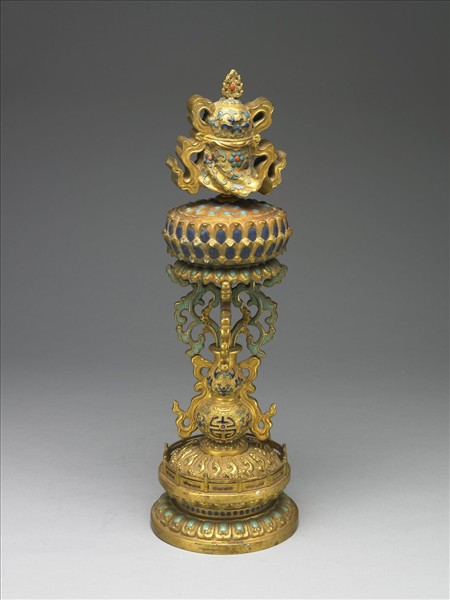 銅胎。金傘以內填方式製作藍、紅花葉紋,上飾火珠,左右飾飄帶,置於蓮花座上,蓮實及花瓣填以琺瑯彩,下以四片卷葉承托插於葫蘆瓶中,瓶上有內填琺瑯蝙蝠紋、番蓮紋及團獸字,兩側飾有飄帶,瓶下為須彌座,下緣蓮瓣紋填以琺瑯。傘為八吉祥供具之一,本件與中琺873~中琺881為成套。
