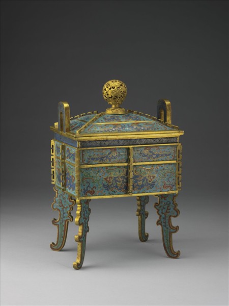 銅胎,蓮瓣座鏤雕龍紋球形蓋鈕,拱門式立耳,夔龍式四足。器內露胎,器表淺藍地,蓋飾各種夔龍紋,四角鑲稜脊;立耳和口沿下飾回紋,腹面中央及四角鑲稜脊,上層飾夔龍,下層飾獸面紋,足飾龍紋。鼎底裝飾纏枝寶相花,中央掐絲填燒藍色「大清乾隆年製」長方框三行楷書款。此器與收羅在《重修宣和博古圖》中周文王鼎之形制紋飾幾乎完全相同,大小也很相近,唯多設一鼎蓋。此類器皿到了後期,成了祭祀中的禮器,或平日做案頭的陳設器。