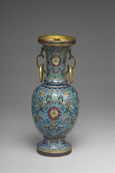 銅胎。撇口,長頸,雙如意環耳,斜肩,圓腹,圈足外撇。以掐絲技法製作花紋,口沿為回紋,頸部為纏枝番蓮花紋及夔龍紋,雙耳以銅絲盤繞卷雲紋,肩部飾一圈如意雲紋,腹部及圈足飾纏枝番蓮紋,圈足下端飾回紋。底部有露胎陰刻「乾隆年製」二行楷書雙方框款。內附一銅膽,瓶為五供之一,本器與中琺885~中琺890成套。