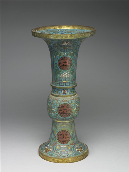 銅胎。撇口,長頸,鼓腹,高圈足外撇。以掐絲技法製作紋飾,全器以淺藍色為地。口沿內飾番蓮紋,外飾一圈回紋,頸部及圈足為蕉葉紋開光內飾蓮花、拐子龍紋、莨苕葉及一團壽字,隙地填番蓮紋,腹部有番蓮紋及一團壽字,圈足下緣飾一圈回紋。