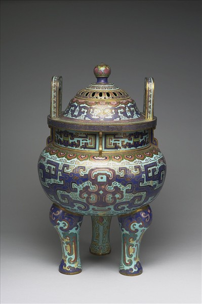 銅胎。直口,雙立耳,短頸,圓腹,三足,帶蓮苞鈕穹頂蓋。全器淺藍色地以掐絲技法製作紋飾,鈕飾蓮瓣紋,蓋頂飾回紋,下接花瓣形鏤空。下方飾如意雲紋及回紋錦地夔龍紋,雙耳飾回紋,器身口沿飾回紋,頸部飾夔龍紋,有四道雲形出戟,腹部為如意雲紋、回紋錦地獸面紋及夔龍紋,足上方飾獸面紋,中間飾夔龍紋,下端飾如意雲紋,背部飾掐絲回紋。