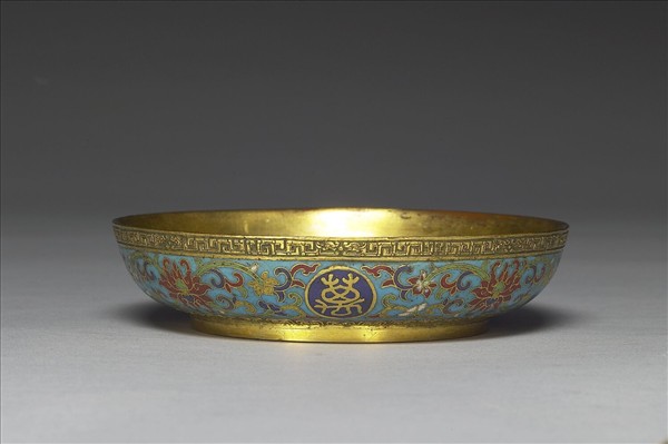 銅胎,侈口弧壁,圈足。口緣鏨拐子龍紋一圈,內皆填淺綠色釉。器壁掐絲淺藍地卷枝番蓮花葉紋,又上有四圓形開光,開光內分別各掐絲藍地篆字「萬」、「壽」、「無」、「疆」,或說明了此器的祝壽性質。器腹近足鏨蓮瓣紋一圈,圈足內刻雙方框「子孫永寶」雙行四字篆款。