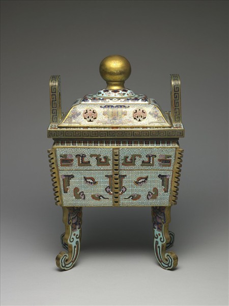 銅胎,器型仿三代銅方鼎,是當時仿作許多的「文王方鼎式」之一例。方口、雙立耳,四板狀夔龍形足,圓鈕方蓋。全器主要以掐絲淡藍地琺瑯為裝飾技法,蓋面有夔龍紋,耳飾回紋與番蓮紋,口緣處回紋,下有蓮瓣紋一周。壁面上方為夔龍紋,下方為獸面紋,腹壁棱脊有六。附銅膽,銅膽內有雙提環。