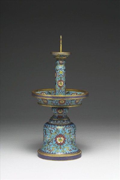 銅胎。由釘形燭阡,支柱,承盤及台座組成。器表淺藍地,以掐絲技法製作花紋,主飾纏枝番蓮紋與花卉紋,承盤口壁及台座圈足均飾回紋。底刻「乾隆年製」雙方框二行楷款。燭台為五供之一。