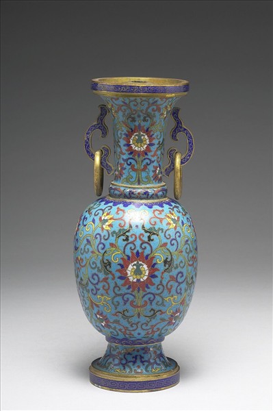 銅胎。侈口立沿,縮腰頸,頸腹間凸稜,碩腹,高撇圈足,雙雲耳帶活環。器表淺藍地,以掐絲技法製作花紋,主要以纏枝番蓮為飾,口壁及圈足各飾回紋一圈。底刻「乾隆年製」雙方框二行楷款。附銅膽。瓶為五供之一。