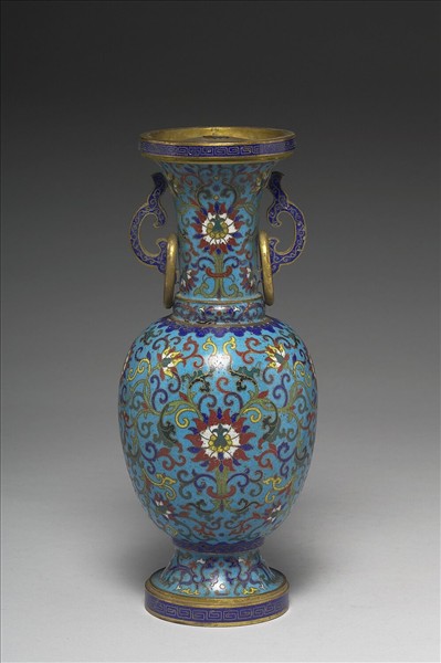 銅胎。侈口立沿,縮腰頸,頸腹間凸稜,碩腹,高撇圈足,雙雲耳帶活環。器表淺藍地,以掐絲技法製作花紋,主要以纏枝番蓮為飾,口壁及圈足各飾回紋一圈。底刻「乾隆年製」雙方框二行楷款。附銅膽。瓶為五供之一。