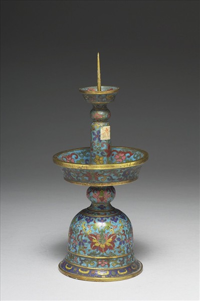 銅胎掐絲琺瑯燭台。由燭阡,支柱,托盤及台座組成。器內外壁皆以掐絲淺藍地番蓮紋、卷枝花卉為主要紋飾。底鏨刻雙方框「乾隆年製」雙行四字楷款。燭台為五供之一,本器與他件燭台、香爐、花瓶同成五供。