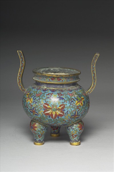 銅胎掐絲琺瑯香爐。圓口,短頸,圓腹,雙朝冠耳,三足。器外壁以掐絲淺藍地纏枝番蓮紋為主要紋飾,耳上掐絲卷草紋。底外有纏枝花葉,並鏨刻雙方框「乾隆年製」雙行四字楷款。香爐為五供之一,本器與他件燭台、花瓶同成五供。