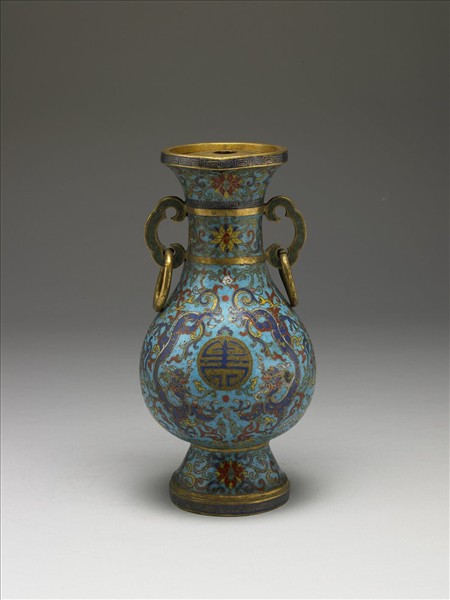 銅胎掐絲琺瑯瓶,侈口直頸,雙如意形耳帶活環,碩腹,高圈足外撇。頸掐絲回紋、淺藍地番蓮紋。腹外壁掐絲淺藍地雙雲龍圍圓「壽」字為飾,前後各有一組,兩邊瓶側,有一紅「壽」字。底外鏨刻雙方框「乾隆年製」雙行四字楷款,有單孔銅內膽。花瓶為五供之一,本器與他件燭台、香爐、花瓶同成五供。