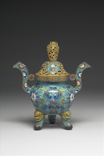 銅胎掐絲琺瑯香爐。短頸,豐肩下斂,雙板形耳,三獸足。蓋雕雲間蟠龍為鈕,蓋身飾鏤空蝙蝠祥雲紋及掐絲梅紋如意雲形開光,器身掐絲淺藍地卷枝番蓮花葉紋,耳飾朵花紋。香爐為五供之一,本器與他件燭台、花瓶同成五供。