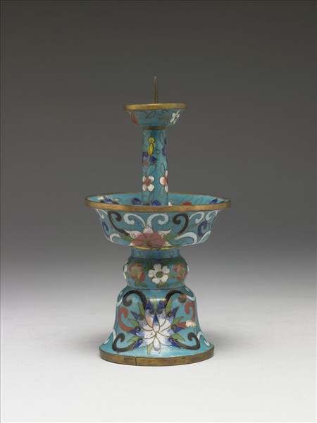 銅胎掐絲琺瑯燭台。由燭阡,支柱,托盤及台座組成。器壁內外主要以掐絲淺藍地卷枝番蓮花葉與朵花為飾,花葉或紅或白、瓣尖或白或藍,並間以色彩多樣的卷葉,整器繽紛而多彩。燭台為五供之一,本器與他件燭台、香爐、花瓶同成五供。