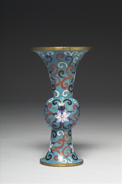 銅胎掐絲琺瑯花觚。撇口,長頸,鼓腹,高圈足。口內掐絲淺藍地番蓮花葉紋,器壁掐絲淺藍地捲枝番蓮花葉,番蓮花瓣均為白色並藍瓣尖。瓶為為五供之一,本器正以花觚作瓶,且與他件燭台、香爐、花瓶(花觚)同成五供。