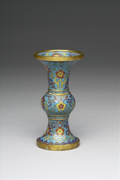 銅胎掐絲琺瑯花觚。撇口,長頸,鼓腹,高圈足。口內掐絲淺藍地番蓮花葉紋,器壁以掐絲淺藍地捲枝番蓮花葉,為主要紋飾。底外鏨刻雙方框「乾隆年製」雙行四字楷款。瓶為為五供之一,本器正以花觚作瓶,且與他件燭台、香爐、花瓶(花觚)同成五供。