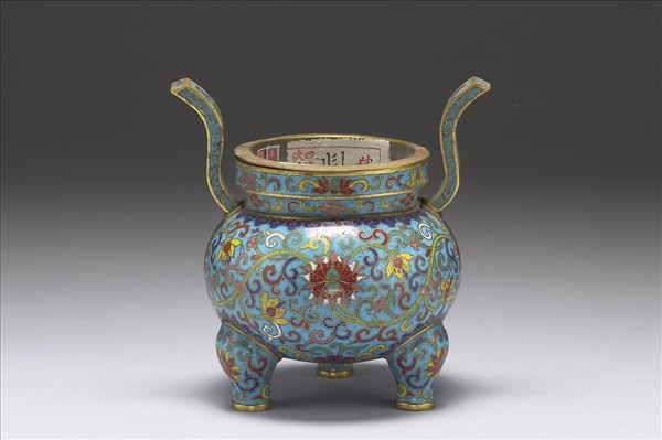 銅胎掐絲琺瑯香爐。圓口,短頸,圓腹,雙朝冠耳,三足。器外壁以掐絲淺藍地纏枝番蓮紋為主要紋飾,耳上掐絲卷草紋。底外有纏枝梅紋,並鏨刻雙方框「乾隆年製」雙行四字楷款。香爐為五供之一,本器與他件燭台、花瓶同成五供。附銅膽。