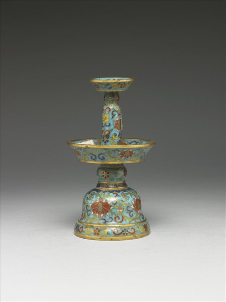 銅胎掐絲琺瑯燭台。由支柱,托盤及台座組成。器外壁以掐絲淺藍地番蓮紋與卷枝花葉為主要紋飾。底鏨刻雙方框「乾隆年製」雙行四字楷款。燭台為五供之一,本器與他件燭台、香爐、花瓶同成五供。