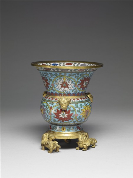 渣斗式罐,撇口,斜肩,附三獸首耳,圓腹,圈足帶三狻猊(獅)形足。口沿為白地朵雲紋,全器淺藍色地,口內為轉枝八瓣花紋,口外為轉枝番蓮紋,下接一圈如意雲形蓮瓣紋,腹部上緣為如意雲形蓮瓣紋,腹部為轉枝番蓮紋,下接一圈蓮瓣紋,圈足飾轉枝六瓣花紋及朵雲紋。底部陰刻「乾隆年製」四字雙行雙方框楷款。
