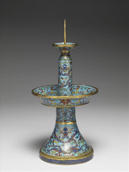 燭台分為三段,各有承盤接合。上端承盤中央開一凹處,接黏燭阡。全器淺藍色地,承盤飾纏枝番蓮紋、海棠花紋、葵花紋,燭狀柱飾龍紋,器座上端飾一對夔鳳紋,下端飾龍紋,上承盤下方及器座邊緣飾回紋。底部露胎,有陰刻「乾隆年製」四字雙行楷書雙方框款。中琺957-961為五供成組。